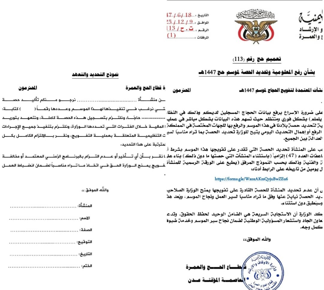 وأبدت وزارة الأوقاف تخوفها من عدم استكمال الحصة المقررة للجمهورية اليمنية والمحددة بـ24.255 حاجاً وحاجة، مبررة إلزام وكالات التفويج بعمل تعهد خطي بالعدد القادرة على تفويجه كي يتسنى لها معرفة التقديرات النهائية لعدد الحجاج الراغبين بأداء مناسك الحج هذا العام وبما يضمن استكمال الحصة المحددة لبلادنا.