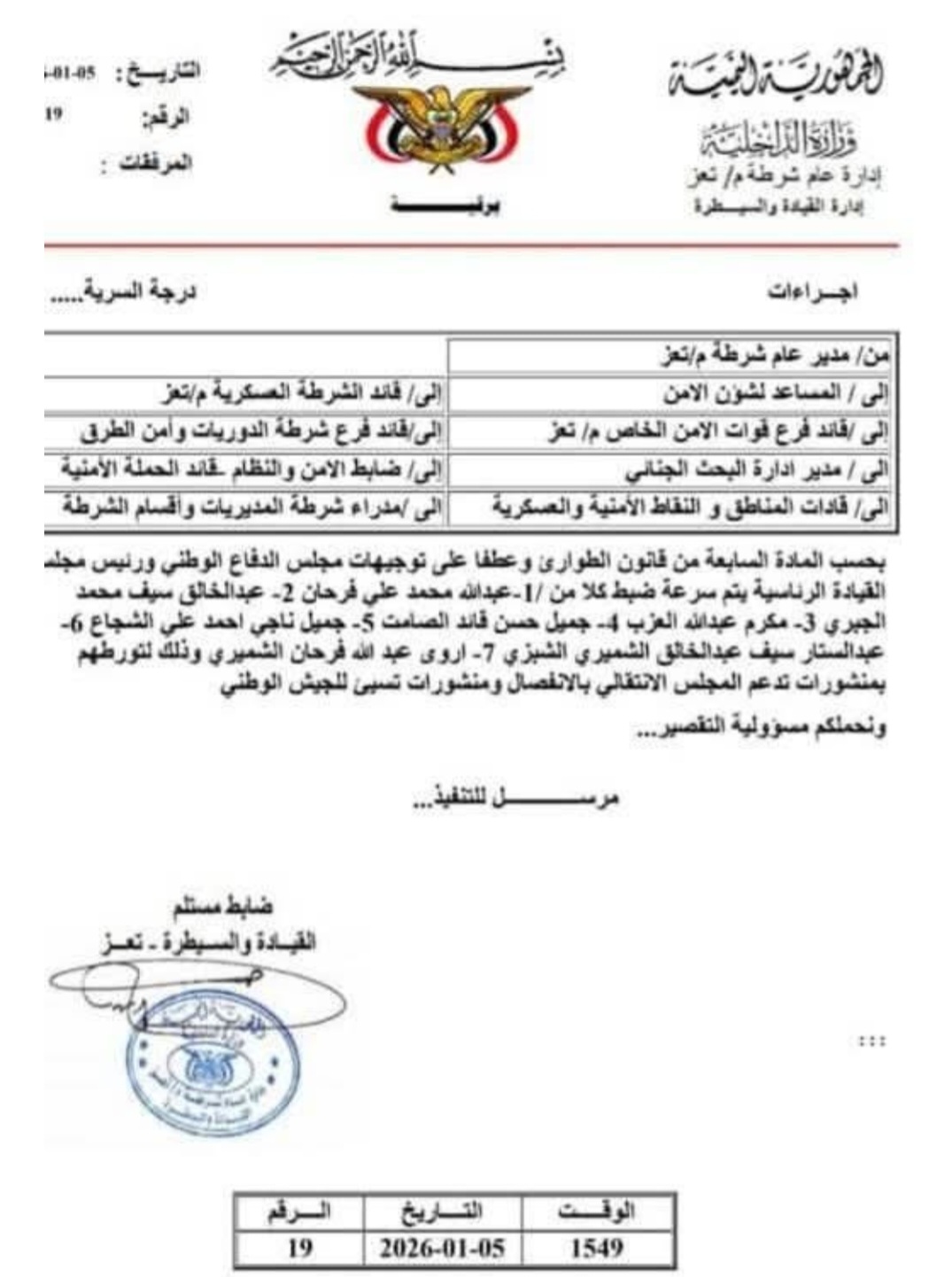 وبحسب الوثيقة المؤرخة في 5 يناير/كانون الثاني 2026م، وُجّهت اتهامات لسبعة من الإعلاميين في تعز، بينهم صحفيون وإعلاميون وناشطون، بزعم دعم المجلس الانتقالي الجنوبي والدعوة للانفصال، إضافة إلى نشر محتوى قيل إنه «يسيء إلى الجيش الوطني»، وفق ما ورد في البرقية.