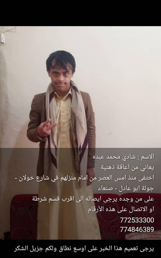 شادي محمدعبده يعاني من إعاقة ذهنية اختفى من يوم أمس شارع خولان جولة أبو عادل ..