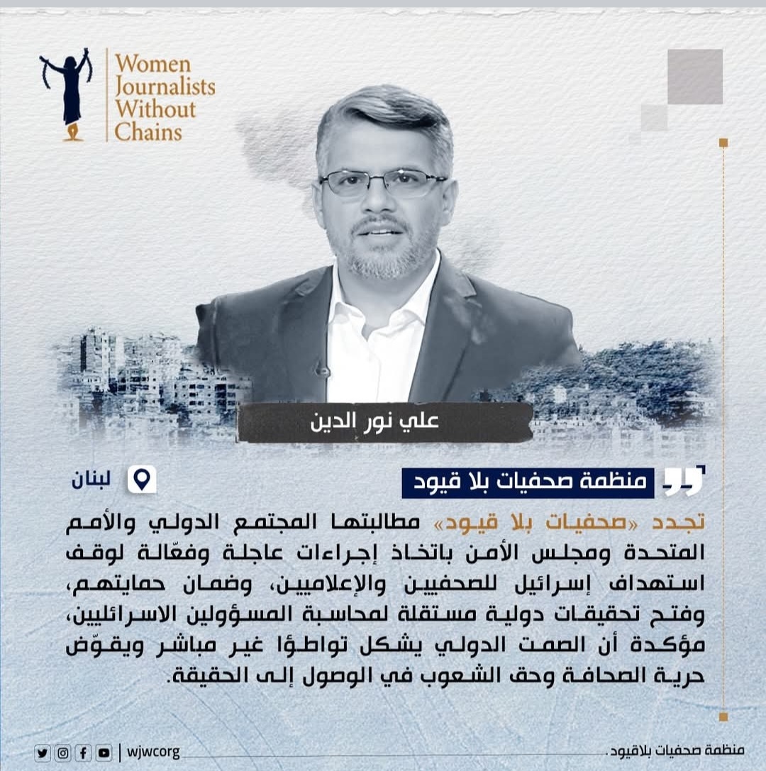 وقالت «صحفيات بلا قيود» إن الاستهداف الذي أودى بحياة الصحفي نور الدين جاء بعد أيام من شن هجمات مماثلة، من بينها هجوم أسفر عن إصابة ثمانية صحفيين جرّاء قصف إسرائيلي استهدف بلدة قناريت جنوب لبنان، الأربعاء 21 كانون الثاني/يناير الجاري، أثناء أدائهم واجبهم المهني في تغطية التطورات الميدانية.