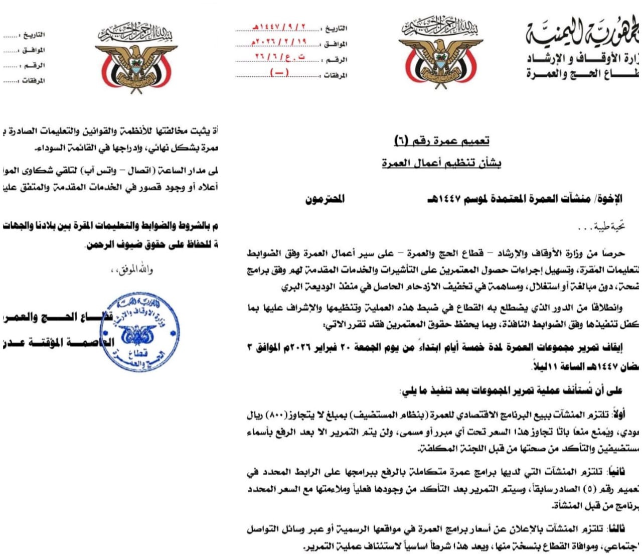 إلى ذلك قررت وزارة الأوقاف إيقاف تمرير مجموعات العمرة لمدة خمسة أيام، ابتداء من يوم غد الجمعة 20 فبراير 2026 الموافق 3 رمضان 1447، الساعة 11 ليلاً، وذلك حرصاً منها على التخفيف من الإزدحام في منفذ الوديعة الحدودي مع المملكة العربية السعودية.